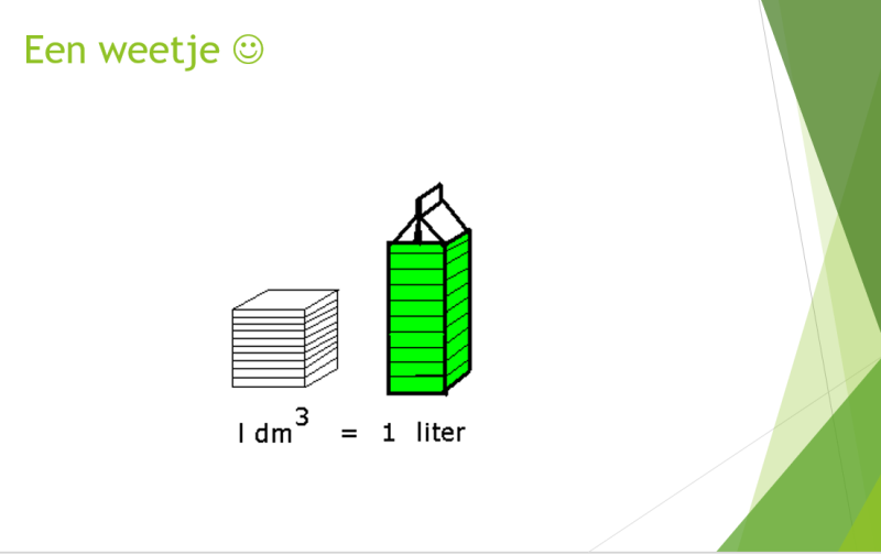 De kinderen weten nu wat ze zicht voor moeten stellen bij inhoudsmaten. Het bleek lastig voor de kinderen om inhoudsmaten om te rekenen van kubieke centimeters naar liters. Ik heb een stappenkaart erbij gepakt en kort een instructie gegeven. We hebben afgesproken de volgende lessen hier verder op in te gaan.